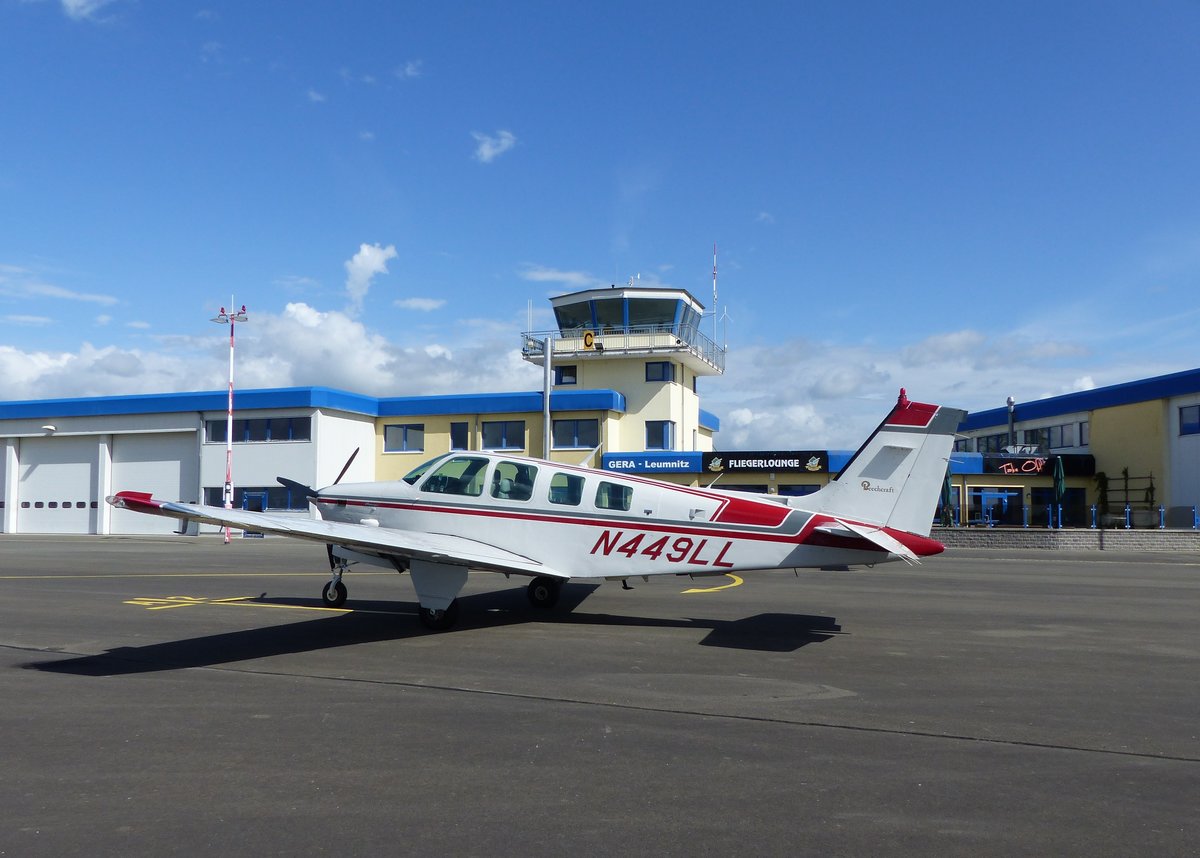 Beech B 36 TC Bonanza, N449LL vor dem Tower in Gera (EDAJ) am 24.5.2020