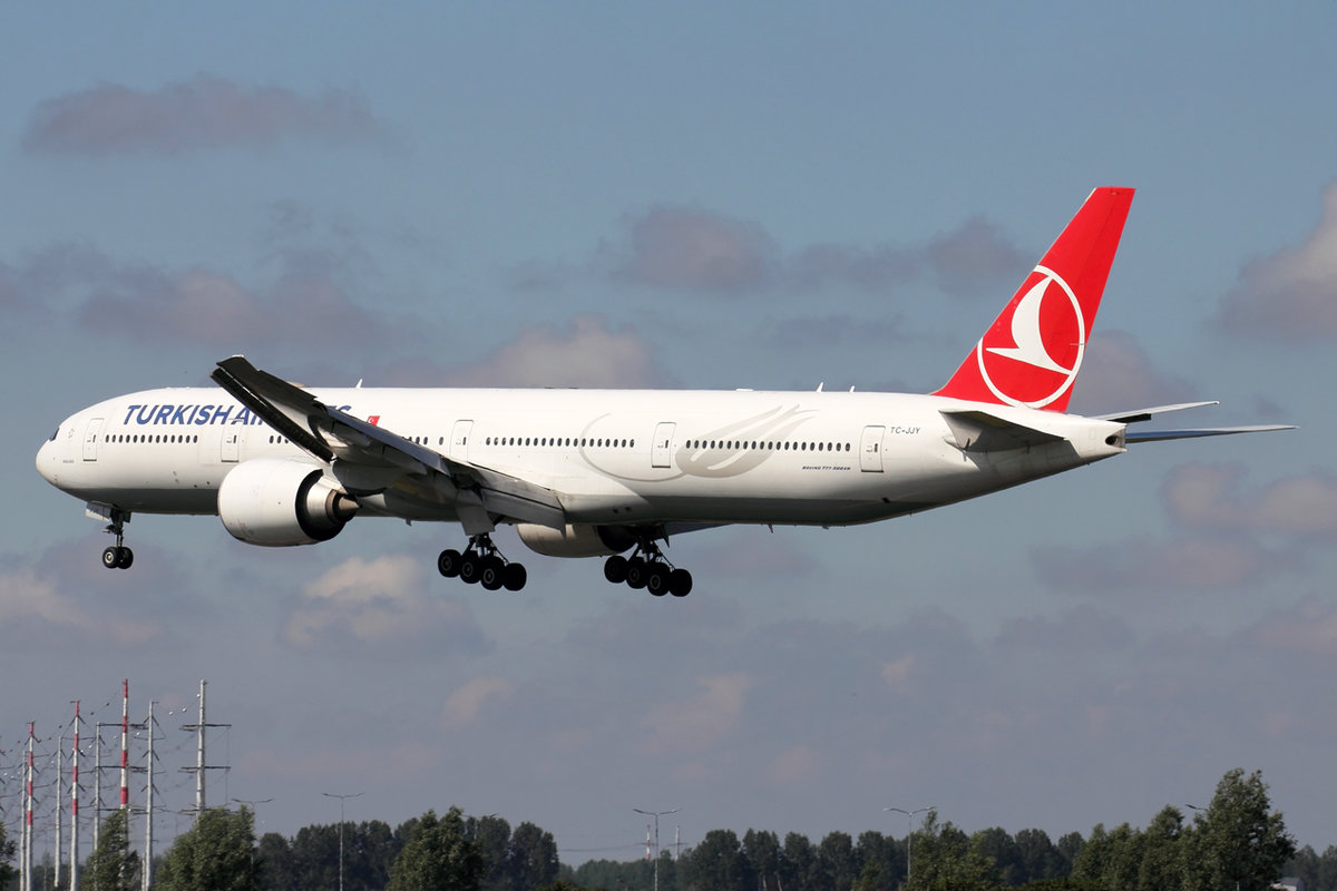 Turkish Airlines Boeing 777-3F2ER TC-JJY bei der Landung in Amsterdam 13.6.2020