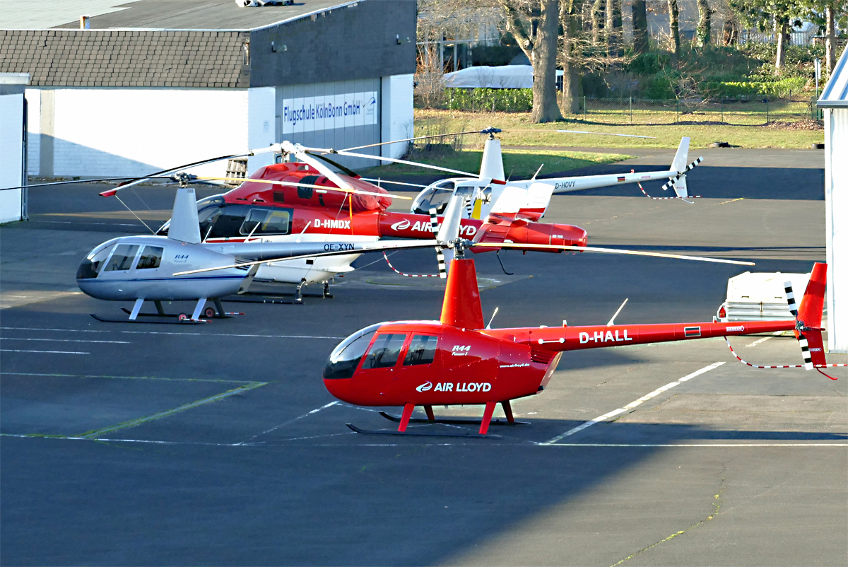 Hubschrauberflotte vor der Air Lloyd-Halle in Bonn-Hangelar. R 44 D-HALL, OE-XYN und D-HOVY, sowie ein MD 900 D-HMDX - 16.01.2020