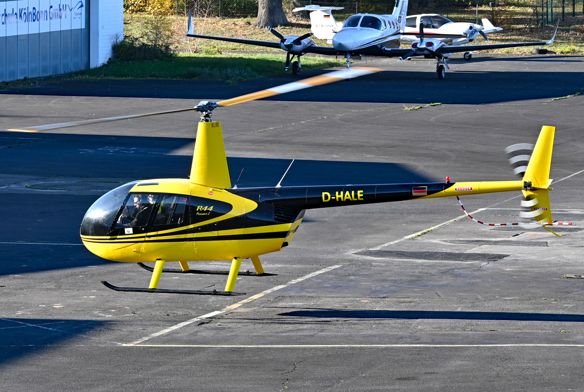 Robinson R44 Raven I, D-HALE, Fa. AirLloyd setzt vor der Firmenhalle in EDKB ab - 18.11.2020