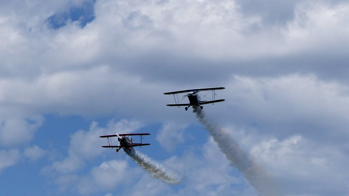 Pitts S2A, N48KA und Pitts S2B, N92ED beim Überflug des Flugplatzes Moosburg auf der Kippe (EDPI) am 4.6.2022