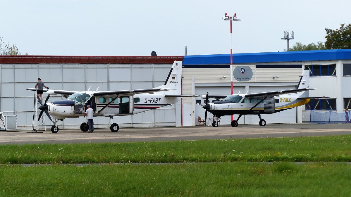 2 Cessna 208 Caravan in Gera (EDAJ). D-FAST beim tanken und D-FALK wartet defekt auf Reparatur.26.8.2023