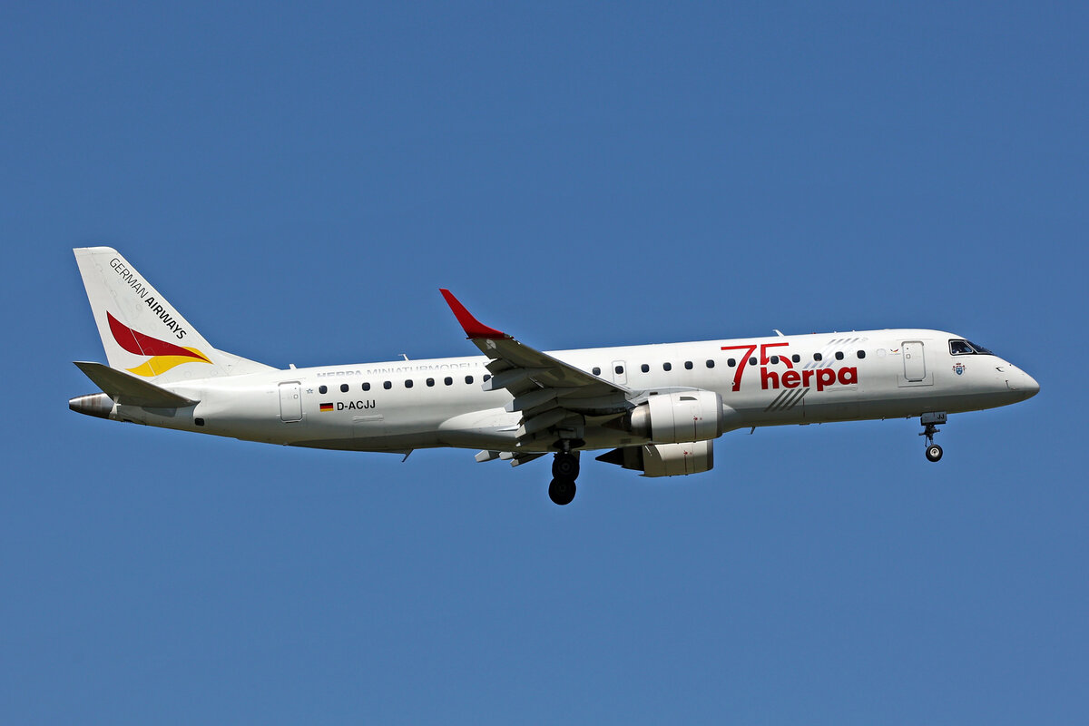German Airways, D-ACJJ, Embraer ERJ-190LR, msn: 19000114, "Herpa Miniaturmodelle 75 Years", 11.August 2025, FRA Frankfurt, Germany.